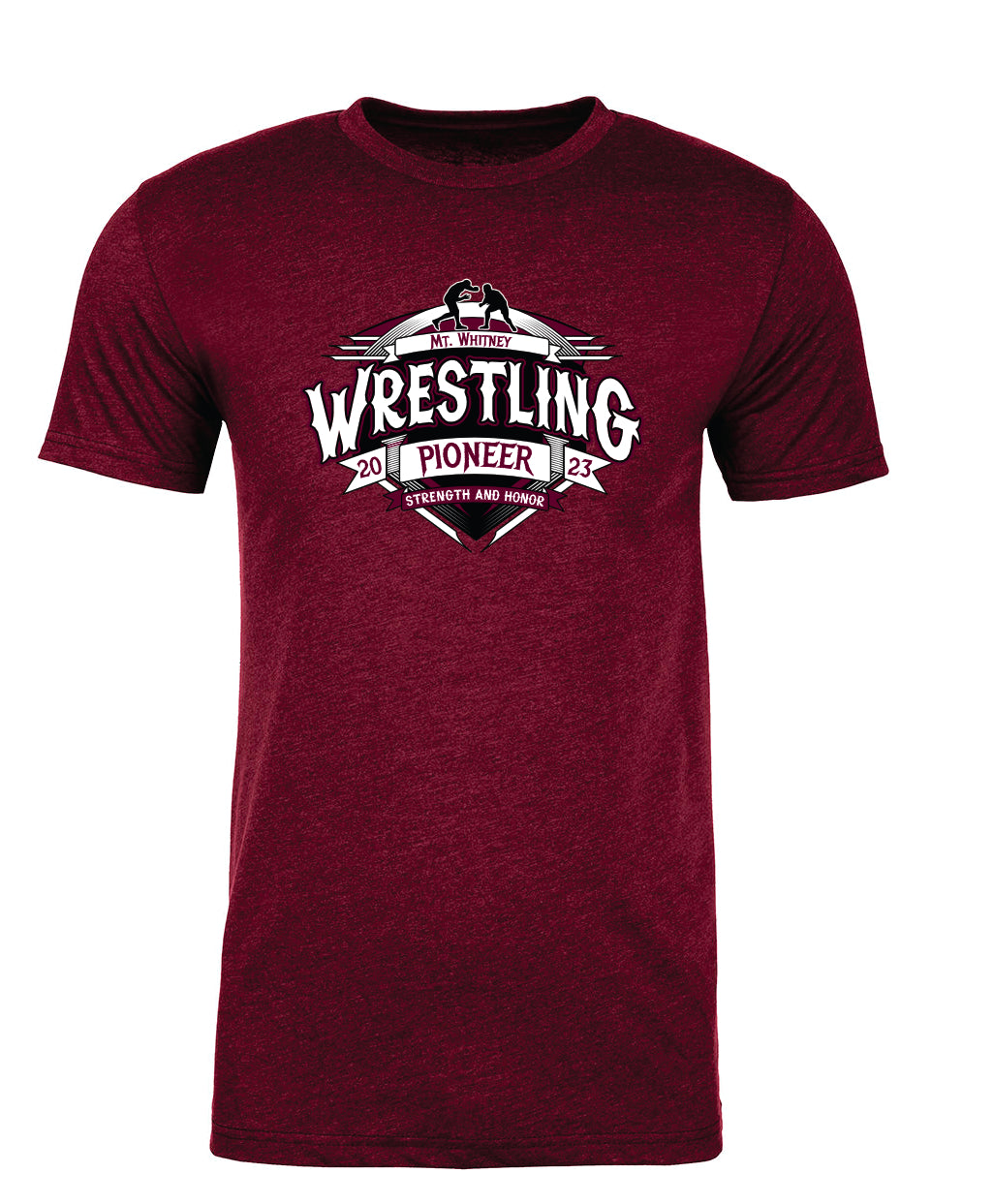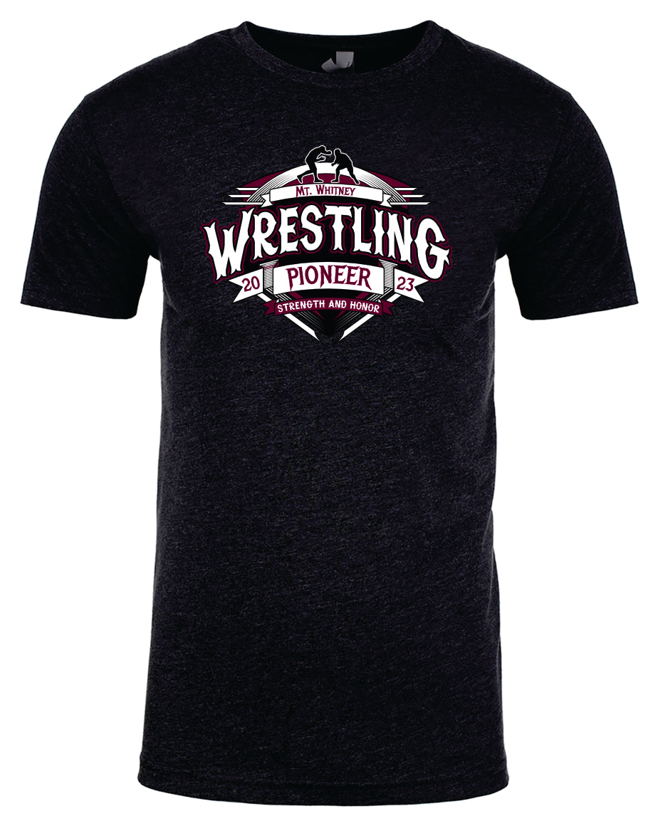 Unleash your inner warrior with Mt. Whitney Wrestling! Made with a lightweight and durable 4.3 oz fabric, this shirt combines the comfort of combed ring-spun cotton with the strength of polyester. Featuring a versatile set-in baby rib collar and reinforced side seams, this shirt is ready for any challenge. Tear away the label and get ready to dominate on the mat!